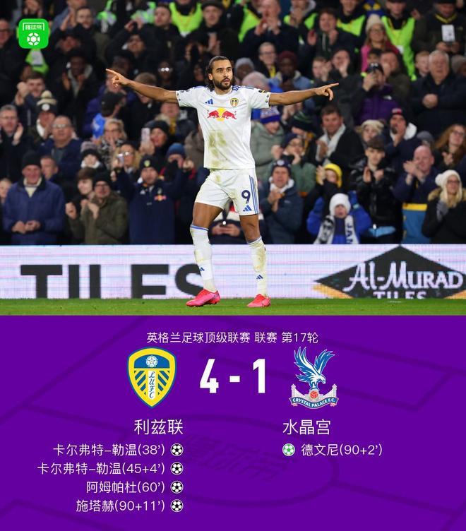 北京時間12月21日,英格蘭足球頂級聯(lián)賽第17輪,利茲聯(lián)坐鎮(zhèn)主場迎戰(zhàn)水晶宮。比賽中,卡爾弗特-勒溫率先破門,為利茲聯(lián)取得領(lǐng)先。隨后比約爾送出助攻,卡爾弗特-勒溫再入一球,完成個人梅開二度。易邊再戰(zhàn),阿姆帕杜接隊友配合后攻入一球,進一步擴大比分優(yōu)勢。水晶宮由德文尼通過點球扳回一分。比賽最后階段,施塔赫抓住機會再下一城,鎖定勝局。最終全場比賽結(jié)束,利茲聯(lián)以4比1戰(zhàn)勝水晶宮。