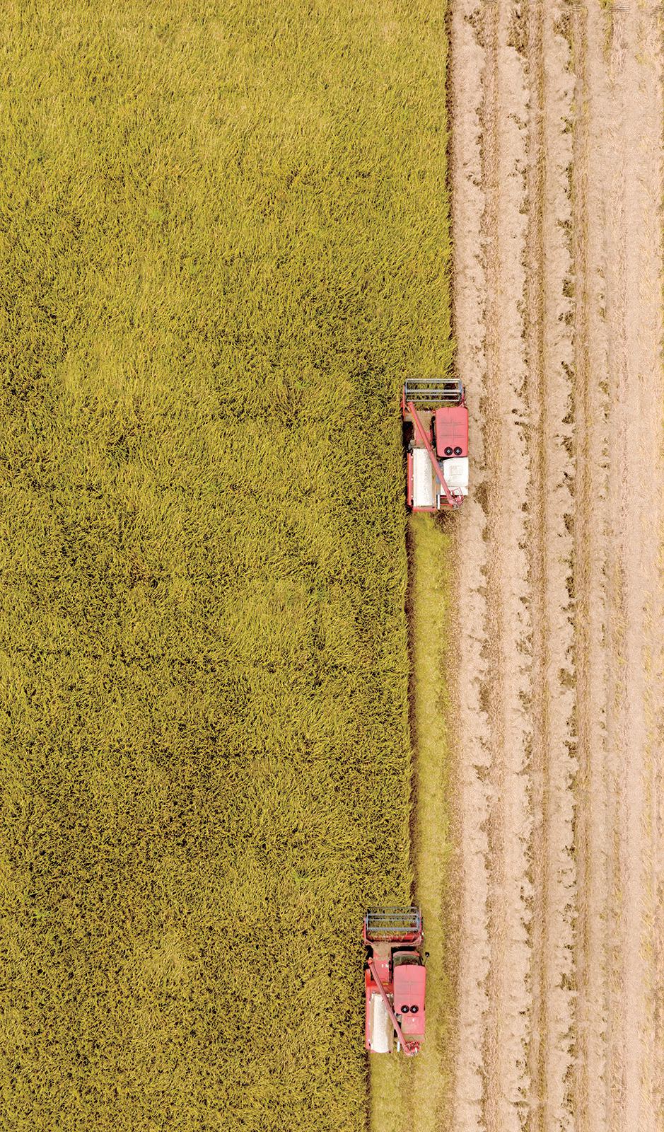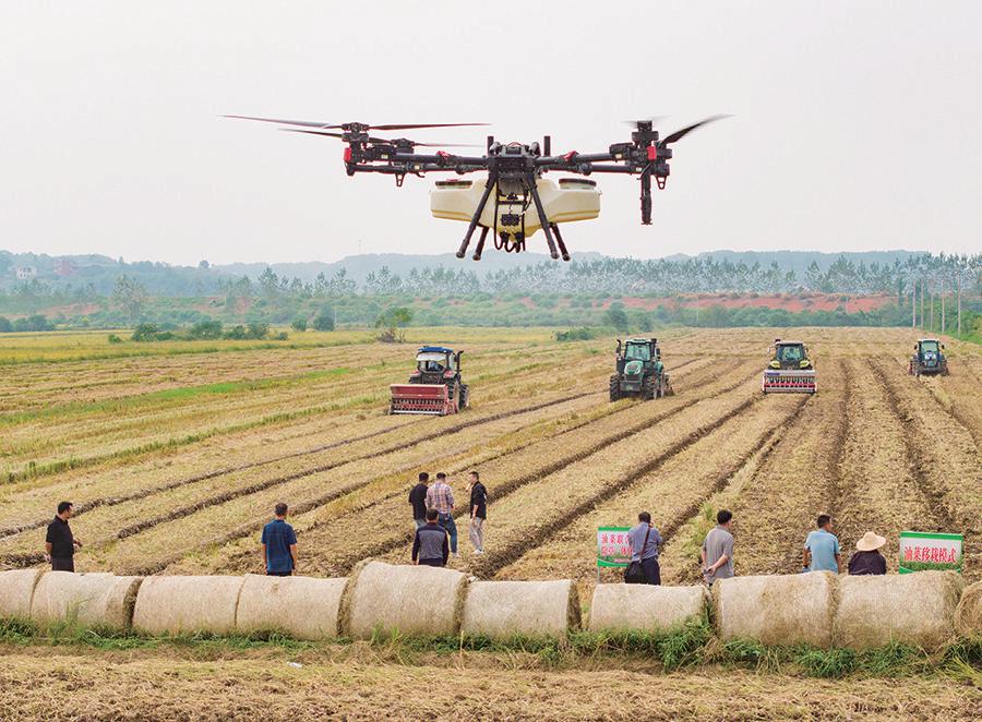 14日,在陽(yáng)新縣荊頭山農(nóng)場(chǎng),多臺(tái)農(nóng)機(jī)在金黃色的稻田里來(lái)回奔忙,植保無(wú)人機(jī)在空中播撒油菜籽。時(shí)值金秋,陽(yáng)新41.8萬(wàn)畝水稻全面進(jìn)入成熟期,全縣1000余臺(tái)智能農(nóng)機(jī)穿梭田間,按下秋收“快進(jìn)鍵”,為全年糧食豐收筑牢堅(jiān)實(shí)基礎(chǔ)。陽(yáng)新計(jì)劃今年油菜播種面積35萬(wàn)畝,小麥播種面積6.6萬(wàn)畝。