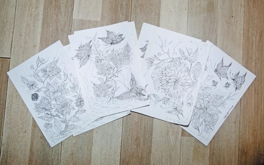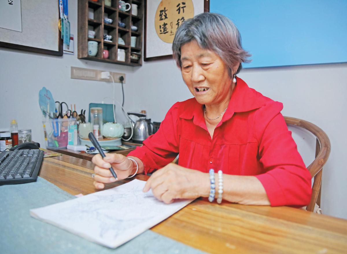 一張張細(xì)膩的白描畫作在桌上鋪陳開來,牡丹含苞、蝴蝶振翅、蜜蜂輕繞。而執(zhí)筆描繪這一切的,是一位80歲的老人曾早紅。