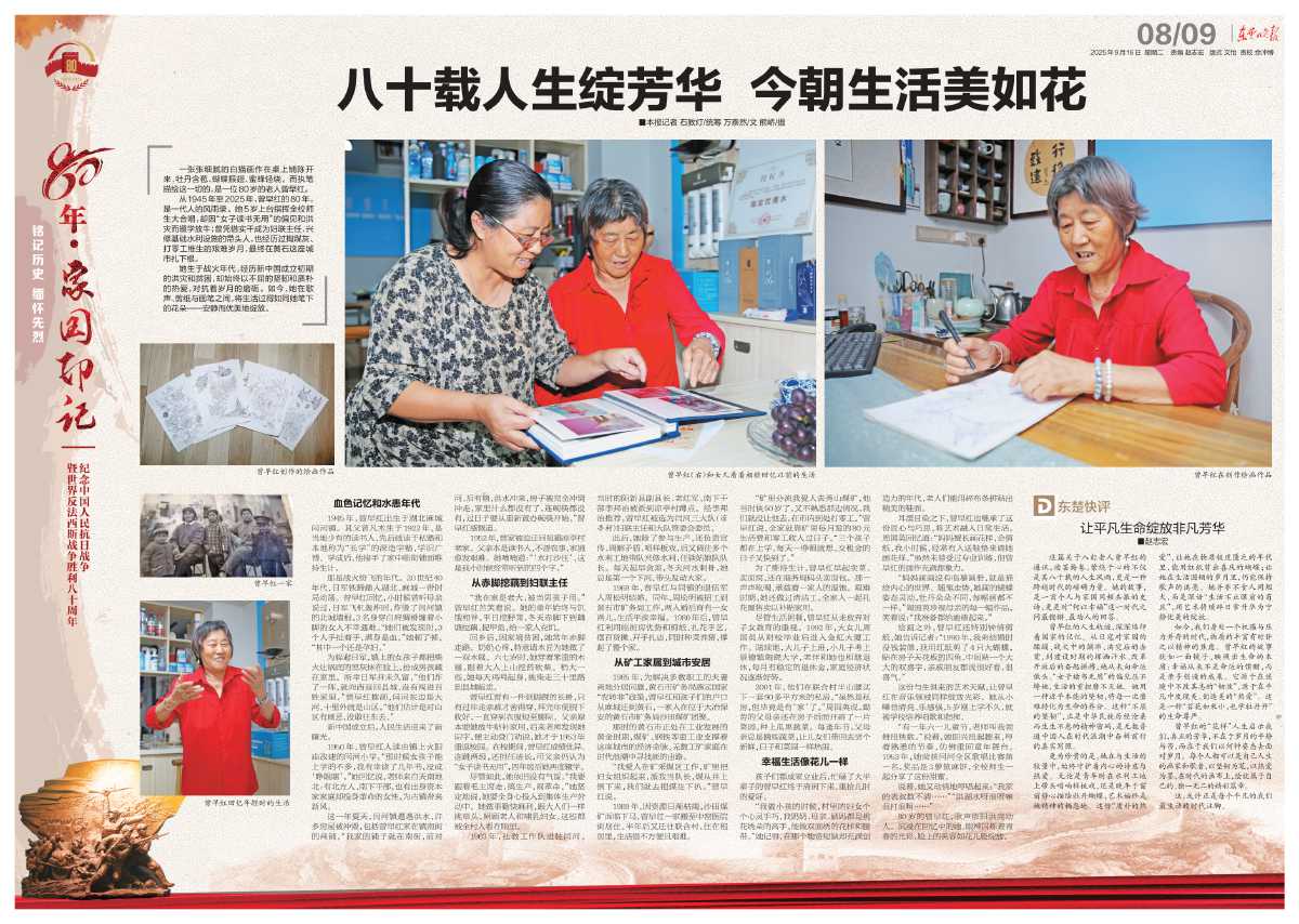 曾早紅的人生軌跡,深深烙印著國(guó)家的記憶。從日寇對(duì)家園的蹂躪、戰(zhàn)火中的顛沛、洪災(zāi)后的赤貧,到建設(shè)時(shí)期的揮灑汗水、改革開放后的奮起拼搏,她從未向命運(yùn)低頭。“女子讀書無用”的偏見壓不垮她,生活的重?fù)?dān)磨不滅她。她用一種近乎本能的堅(jiān)韌,將每一次磨難轉(zhuǎn)化為生命的養(yǎng)分。這種“不屈的堅(jiān)韌”,正是中華民族歷經(jīng)滄桑而生生不息的精神密碼,是無數(shù)普通中國(guó)人在時(shí)代浪潮中奮楫前行的真實(shí)寫照。