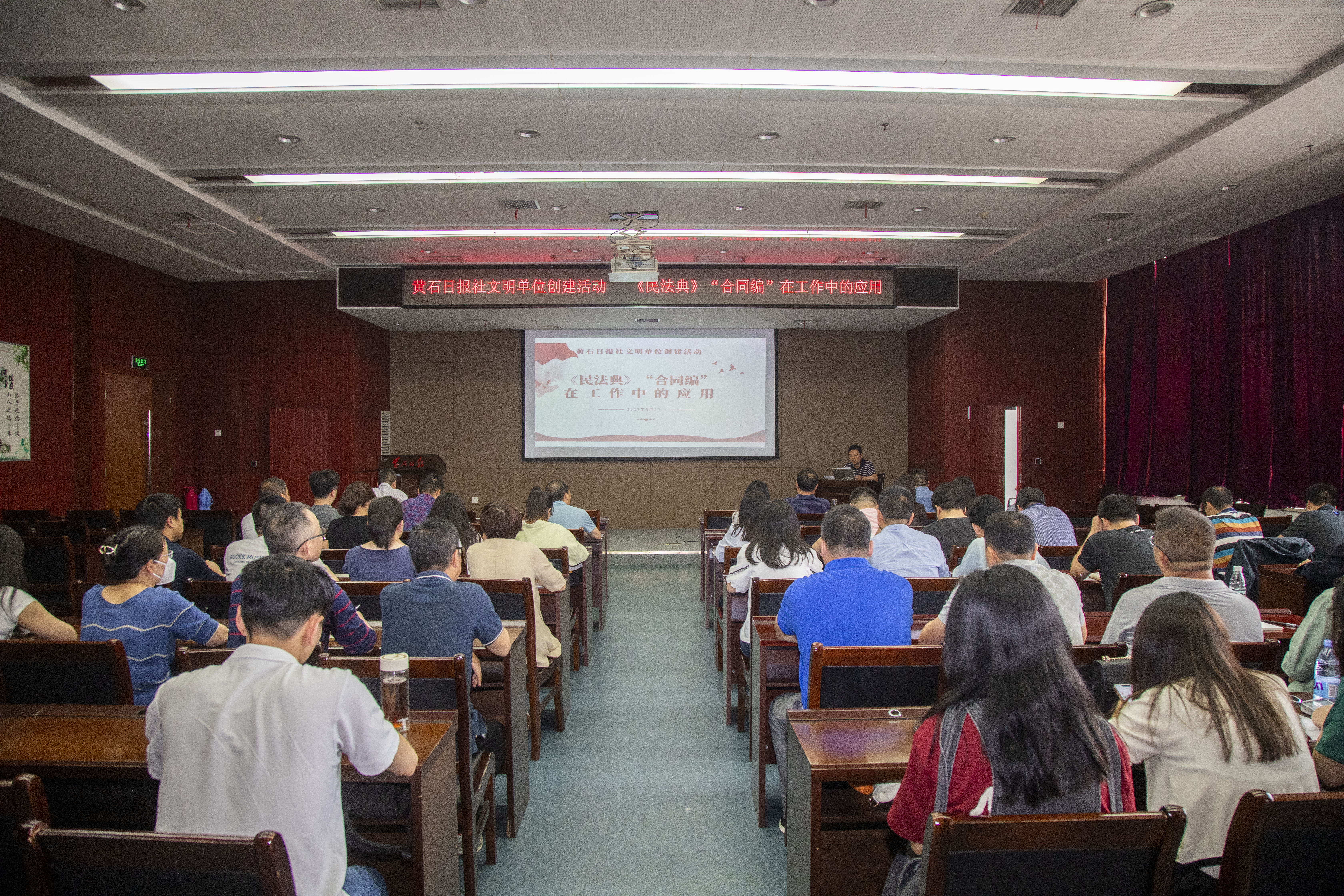 5月17日下午,為進(jìn)一步加強(qiáng)文明單位的創(chuàng)建與管理,黃石日?qǐng)?bào)社在報(bào)社三樓學(xué)習(xí)報(bào)告廳開(kāi)展法治宣傳及普法教育活動(dòng),報(bào)社經(jīng)營(yíng)辦負(fù)責(zé)人講解了《民法典“合同編”在工作中的應(yīng)用》。報(bào)社采編部門(mén)60余名工作人員參加了學(xué)習(xí)活動(dòng)。(記者?周?。?/p>